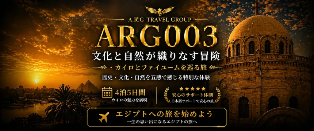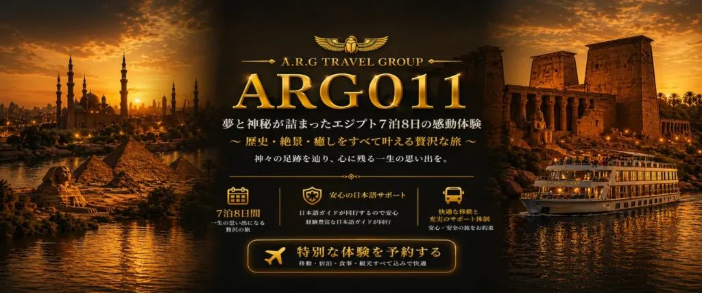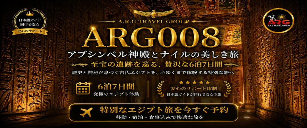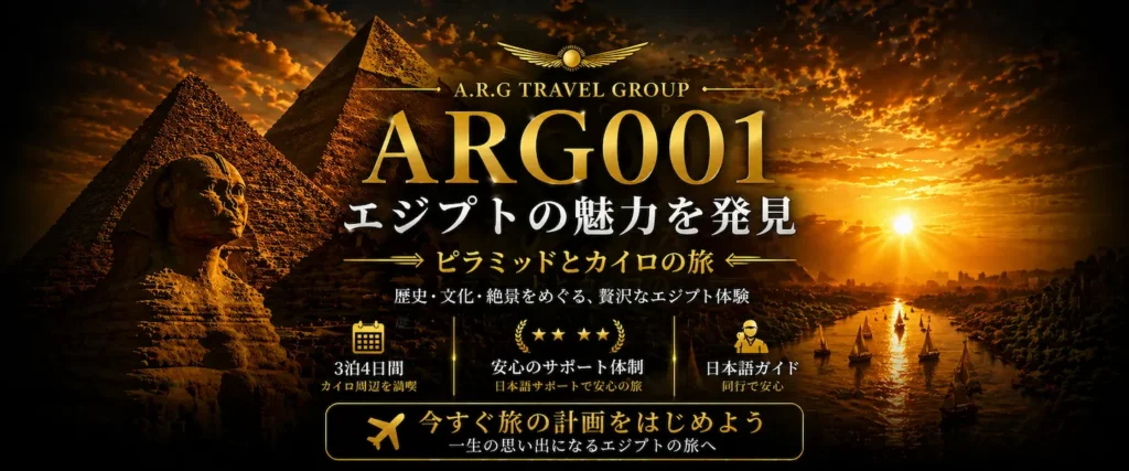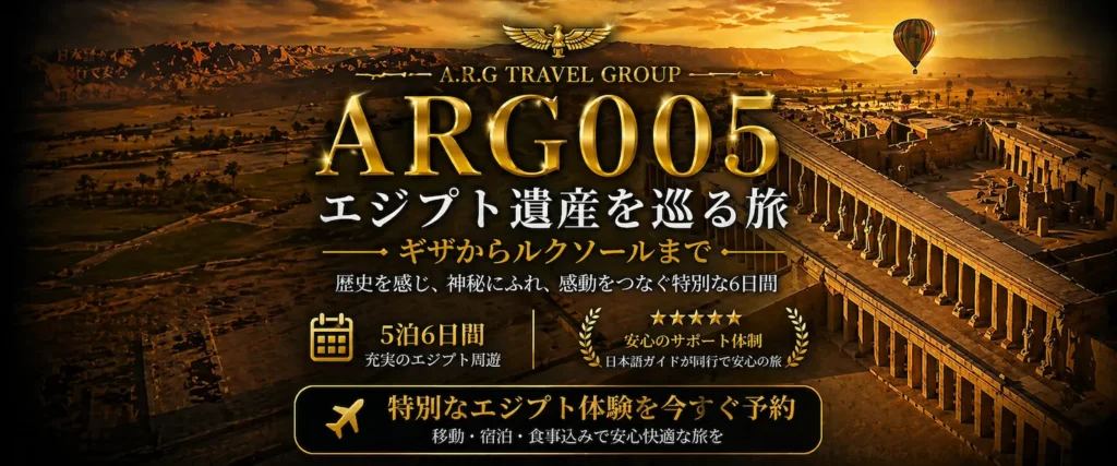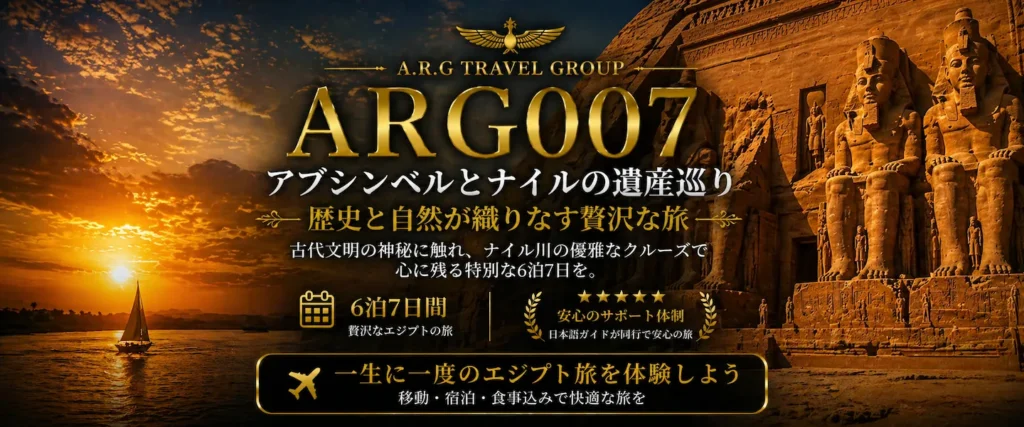 エジプトツアー専門店ARGエジプト・トラベルでは、日本以外国在住の日本人の皆様に向けて、エジプト現地発着ツアーを提供しています。私たちは、エジプト旅行を安心・快適に楽しめるよう、特別なプランをご用意し、大変多くの皆様にご愛顧いただいております。